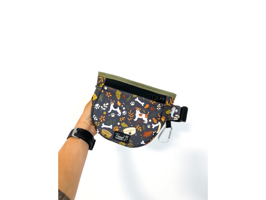 - Malý pamlskovník (cca 15 × 15 cm) nabízí verzi bez dalších kapes, nebo s voděodolnou zipovou kapsou na přední straně, vhodnou na drobnosti jako klíče či peněženku (telefon se sem nevejde).