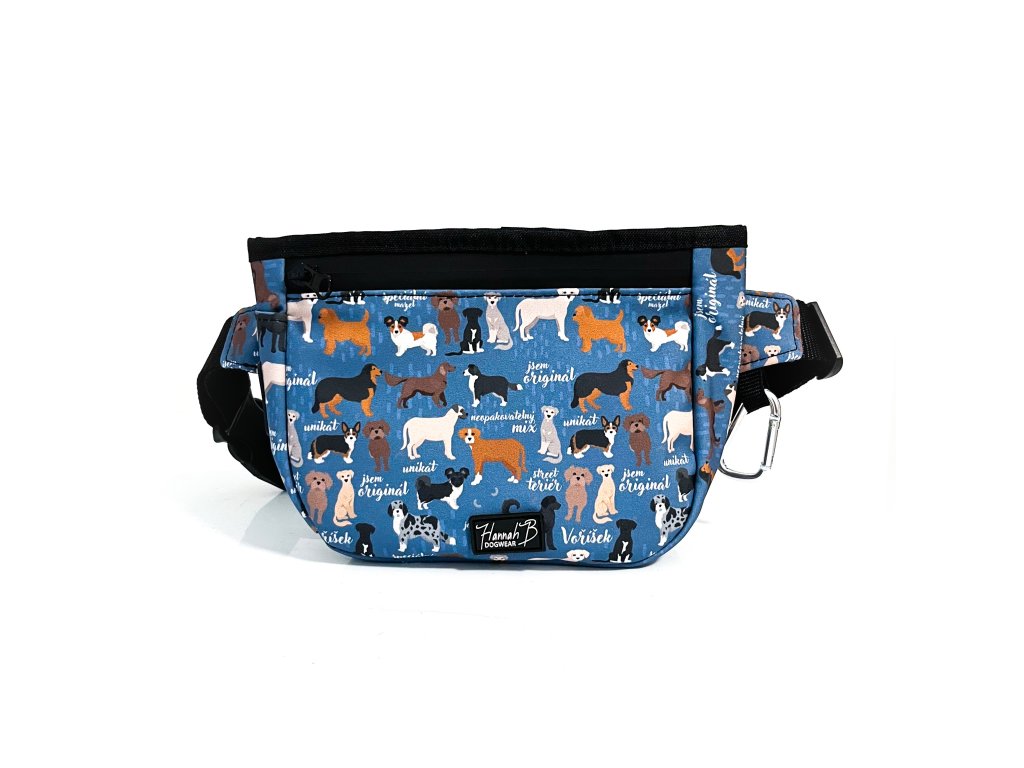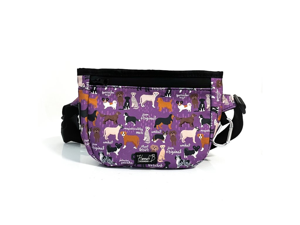 - Malý pamlskovník (cca 15 × 15 cm) nabízí verzi s voděodolnou zipovou kapsou na přední straně, vhodnou na drobnosti jako klíče či peněženku (telefon se sem nevejde).