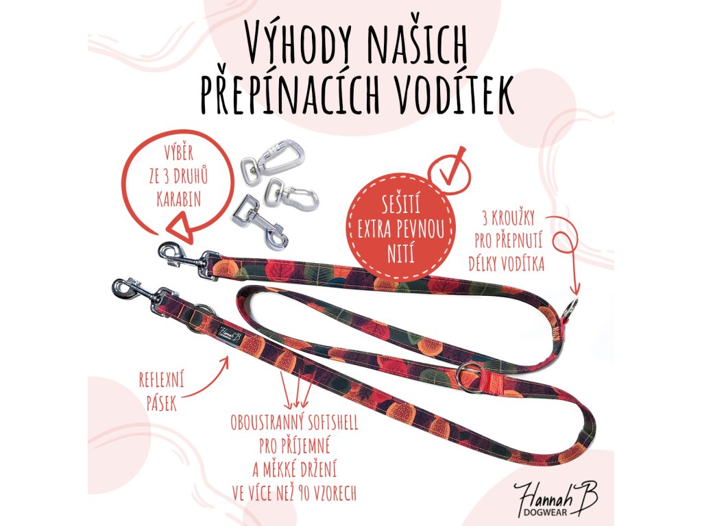 - přepínací: délka 200cm, dvě karabiny (můžete si nastavit také každou jinou, jako 1. karabina je počítána ta, kterou připínáte k obojku), šířka pouze 2,5cm